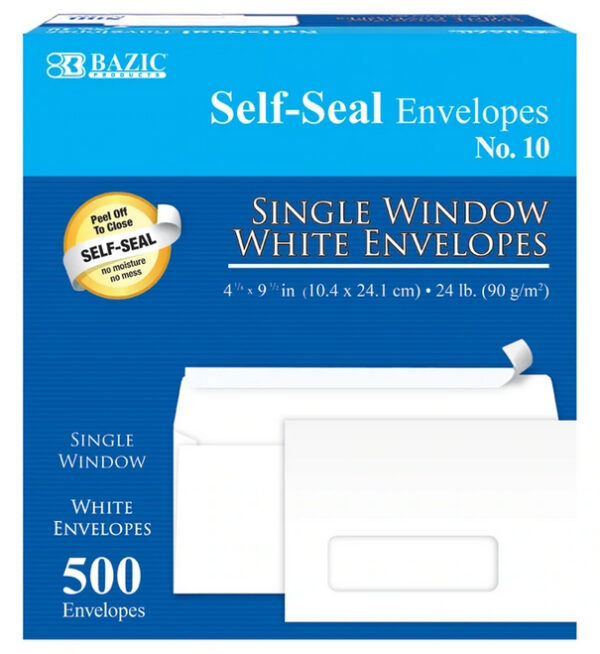 - 10 SELF-SEAL WHITE SINGLE WINDOW ENVELOPES. These 4 1/8″ x 9 1/2″ inch self-sealing windowed envelopes are designed to save your time and money. Helps you fly through mailings in record time.